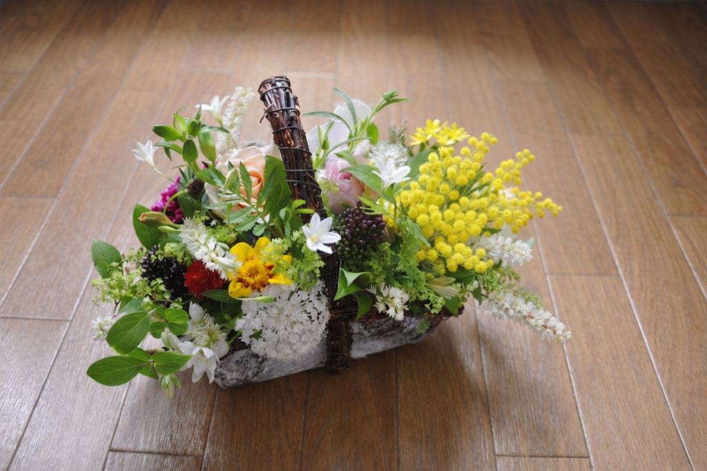 春を告げる花として愛されるミモザを主役に、バスケットいっぱいの明るい色彩を詰め込みます。